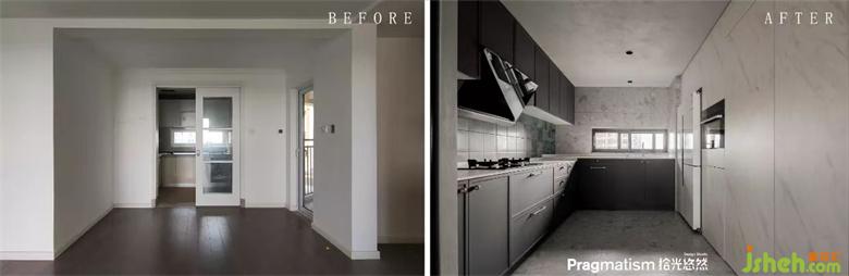 ?. 入戶+廚房+生活陽臺:原始戶型中,餐廳、生活陽臺和廚房都集中在入戶左側(cè),每個空間使用起來都非常局促。因此我們將廚房空間擴(kuò)大,生活陽臺門后移,以隱形門的形式,與從入戶延伸而來的飾面板融為一體,優(yōu)化空間的同時,擴(kuò)充鞋柜面積,削弱入戶門的這道“拐”。