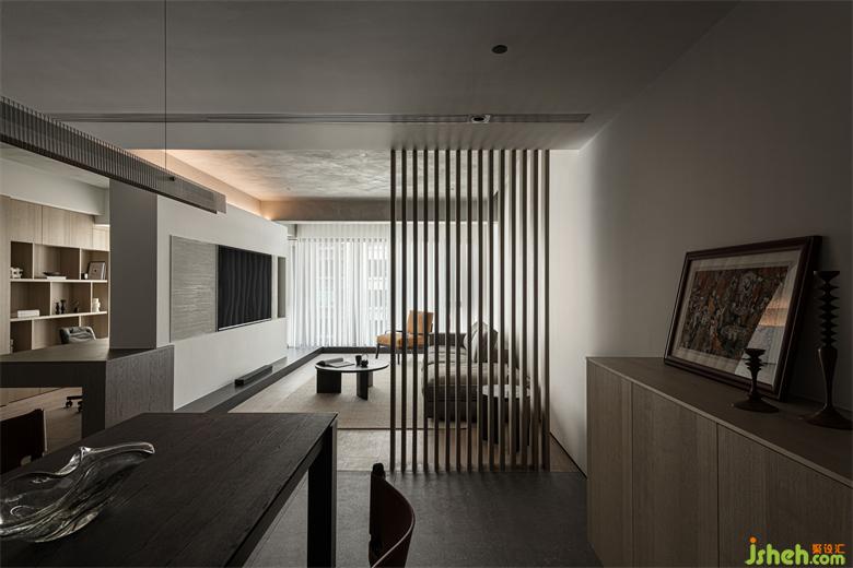 家裝設(shè)計(jì)入戶(hù)與客廳用木格柵進(jìn)行隔擋,隔而不斷,透而不明。