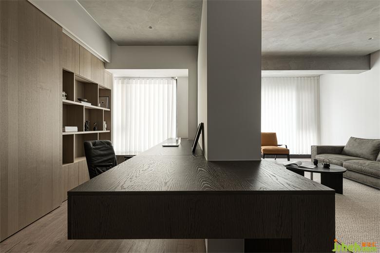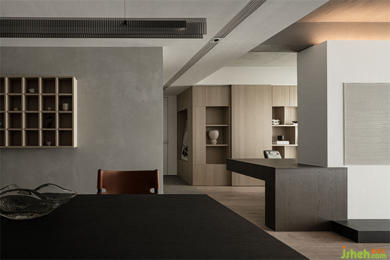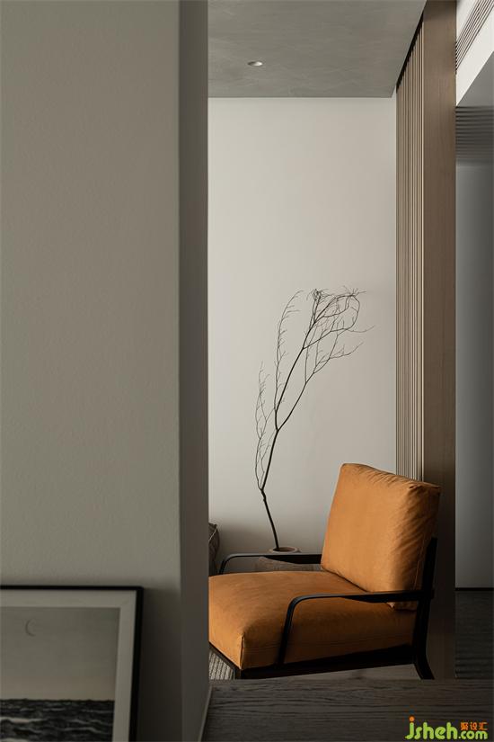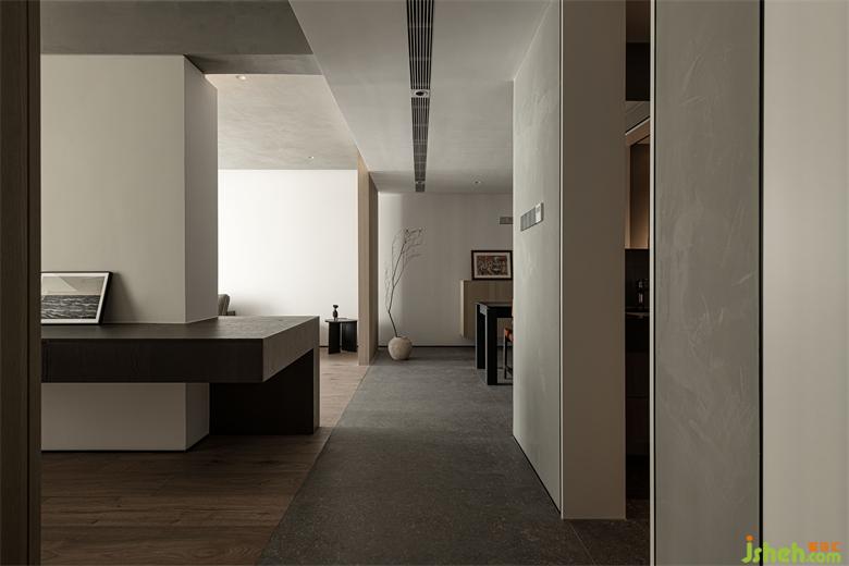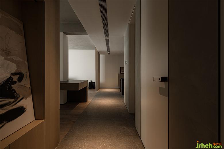 家裝設(shè)計師希望公區(qū)的延展性和獨立區(qū)域的氛圍感能夠兼具,因此通過材質(zhì)區(qū)分、色彩對比及燈光應(yīng)用,來達到這樣的效果。