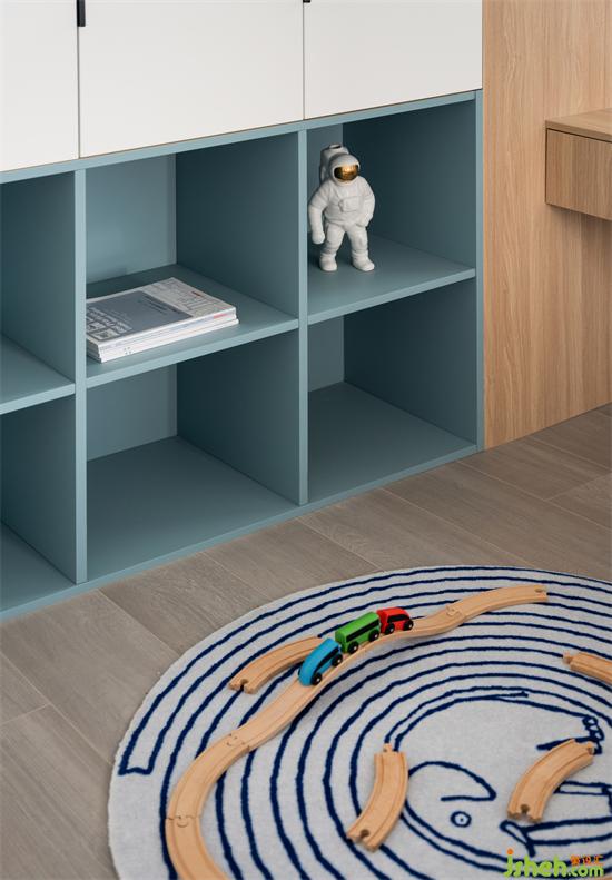 大面積的置物架+儲物柜組合,寶貝們的圖書、玩具、學習用品都有了大量的儲藏空間。家裝設計如今這方小天地與一旁的客廳已經成為大寶無縫銜接的學習玩樂場所。