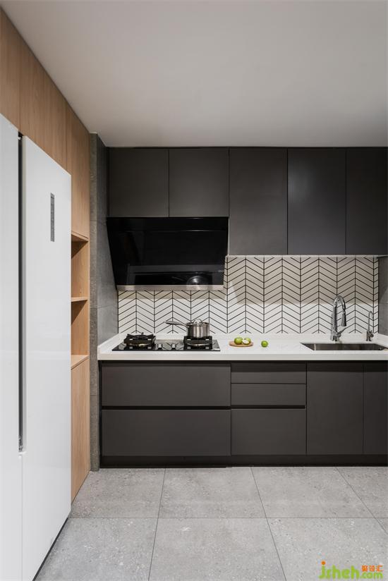 廚房是整個(gè)公共區(qū)域?yàn)閿?shù)不多,采光不佳的地方。受到墻體的限制,廚房做成了半開放式,家裝設(shè)計(jì)將部分自然采光引入其中,并且將西廚功能外置在餐廳處,增加了整個(gè)廚房系統(tǒng)的操作面積。