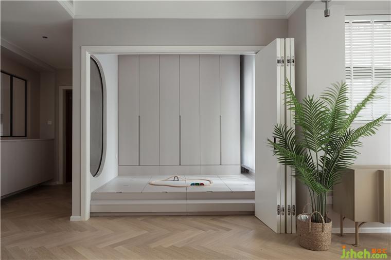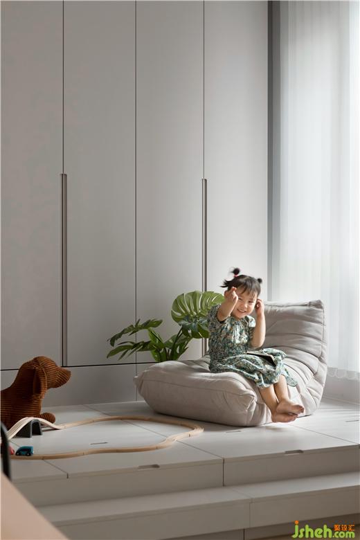 (1)充分利用客廳及休閑陽(yáng)臺(tái),成都中環(huán)島裝修將其改造為集閱讀、辦公、玩耍、休息功能為一體的空間,同時(shí)能夠承載小朋友成長(zhǎng)過(guò)程中的興趣愛(ài)好