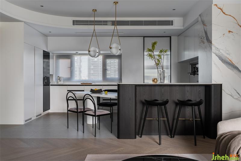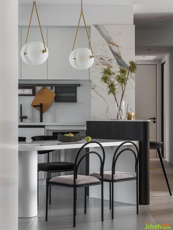 藝術(shù)家設(shè)計(jì)餐桌通過45度左右的柔性斜角處理,不但可以解決入戶餐桌的不好放置的問題, 還能確??蛷d的全景觀和采光度。一臺(tái)兩用,即可以作為島臺(tái)使用,也可以作為水吧臺(tái)使用