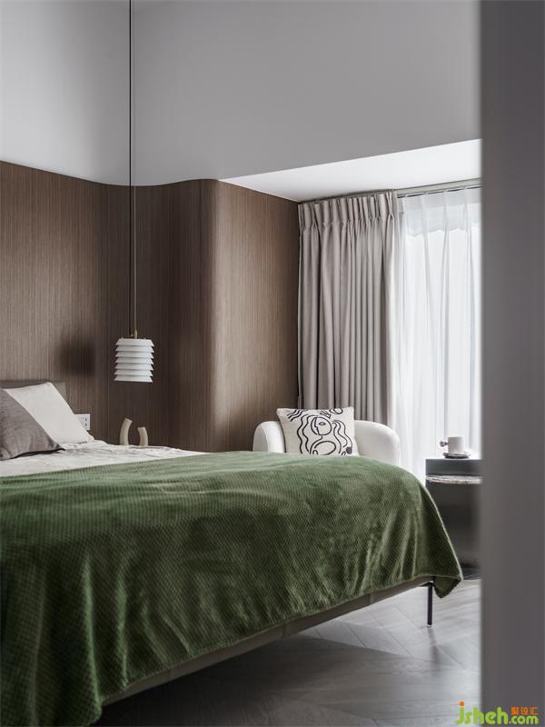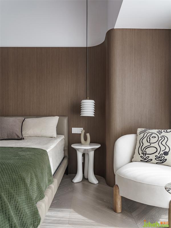曲面的床頭柔化了原本墻體的轉(zhuǎn)角結(jié)構(gòu)。