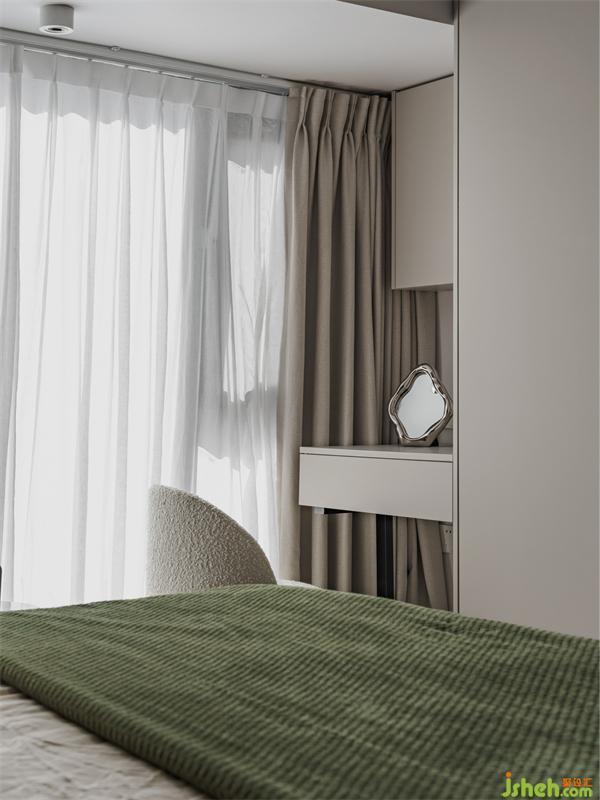 梳妝臺(tái)設(shè)計(jì)在窗戶的位置,床頭采用溫暖的木飾面,而柜子則采用白色,這樣在色彩上便有了對(duì)應(yīng)的關(guān)系。
