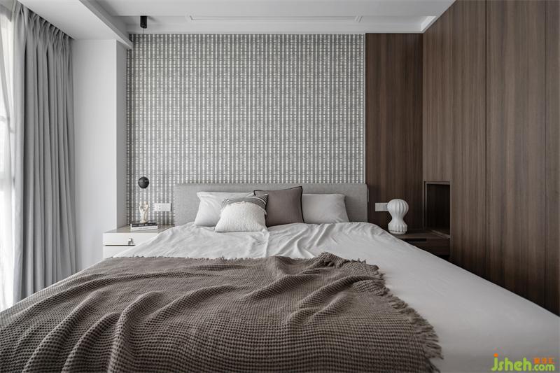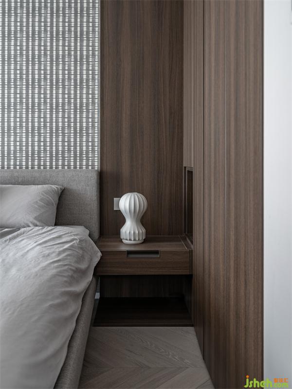 床頭部分不完全的“統(tǒng)一”。木飾面縱向延伸柜子的長度,從而拉長空間的線條感,而橫向效果又能起到美化的裝飾作用和擴(kuò)寬空間整體的尺度感。