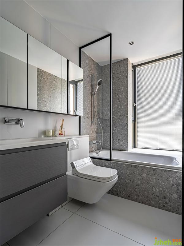 主衛(wèi)和公衛(wèi)都同樣采用了大面積的鏡面玻璃,這樣可以使空間整體的光感更加通透,黑色的柜體和灰色大理石相互搭配就是高級感的范本。