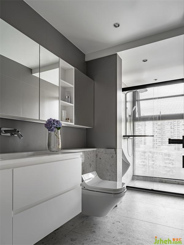 藝術(shù)家設(shè)計(jì)把原本生活陽臺的面積納入到了公衛(wèi),多出來的部分剛好做一個(gè)小便斗,這樣既舒適又衛(wèi)生。當(dāng)然儲物收納也是必不可少,洗手臺的上下方都設(shè)計(jì)了儲物柜。