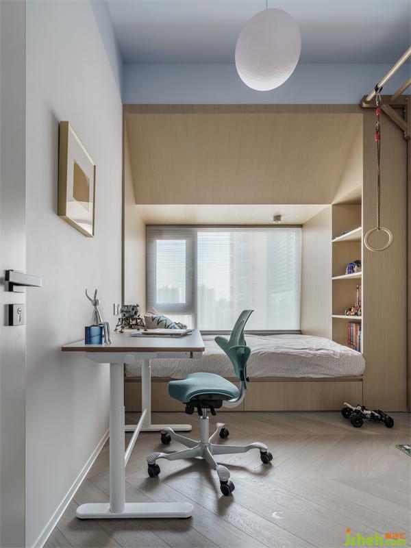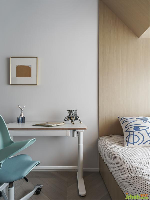 小小男子漢的房間,考慮到小朋友的不斷成長對居住空間的需求性,在男孩房的設(shè)計(jì)上偏向沉穩(wěn)一些的風(fēng)格,床的上方做了斜面的處理和三角型結(jié)構(gòu),這樣可以解決原本床在凸窗的位置和房梁帶來的局限性和壓迫感,即使一種材質(zhì)通過形體的變化也能讓空間更有多維層次感,也能起到擴(kuò)大空間視覺效果的作用。