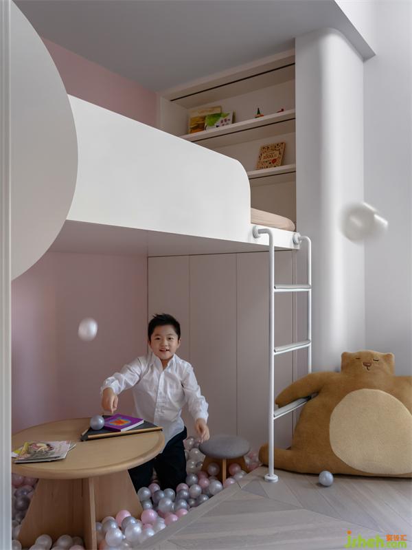 女孩房原本帶有一個(gè)洗手間,業(yè)主很希望滿足小女孩一個(gè)雙層床功能,但因?yàn)槭窍词珠g有下沉,層高不夠雙層床的合理尺度,某天突發(fā)奇想將下沉挖開,做成一個(gè)下沉式兒童空間,將劣勢轉(zhuǎn)換為優(yōu)勢,這樣不但解決層高問題,還可以偶爾作為泡泡池玩,何樂而不為。