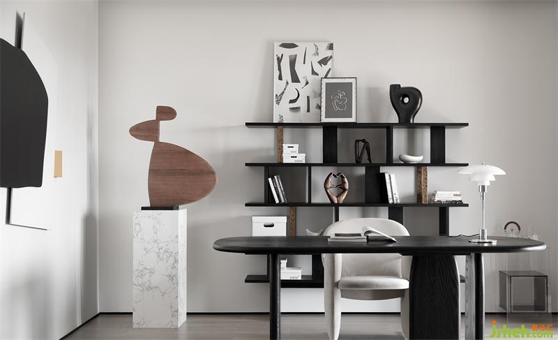 書房選用深色木質(zhì)書桌與書柜,打造出沉靜的空間感。簡約大氣的落地藝術(shù)擺件,結(jié)合大理石和木材的自然紋理走向,讓空間兼顧美觀性的同時,植入安靜純粹的精神觀感。
