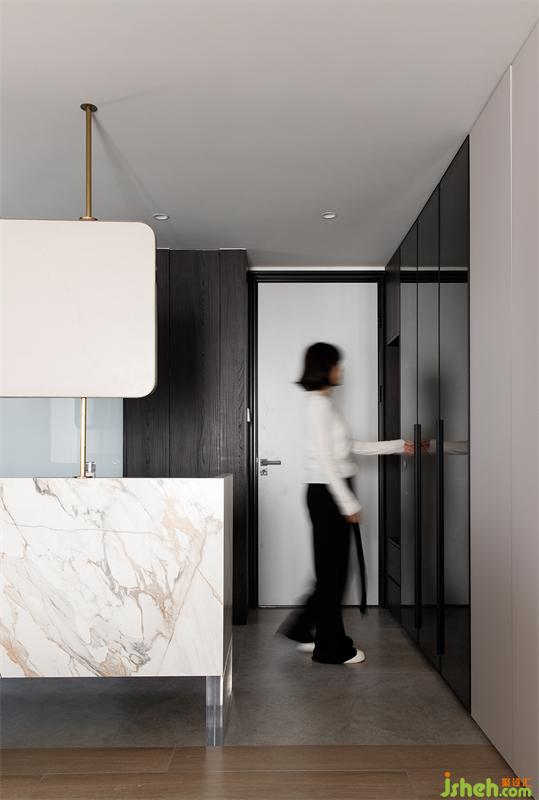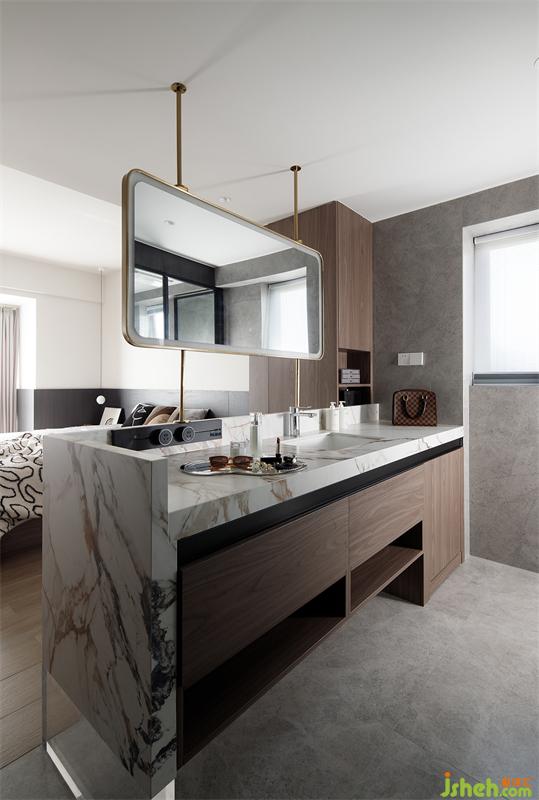 外置的洗漱臺(tái)上方,金屬邊框的化妝鏡懸空而立,不影響室內(nèi)的采光,形成隔而不斷、清爽透氣的布局。