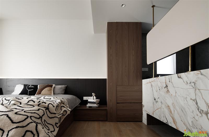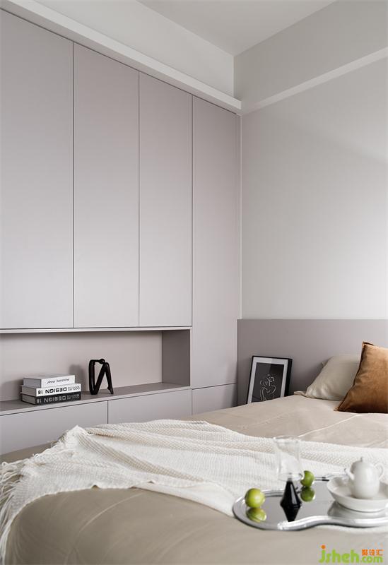 床頭定制一整面頂天立地衣柜提升儲(chǔ)物能力,衣柜中部做了留空處理,讓這個(gè)狹小的空間看起來(lái)更有層次感。