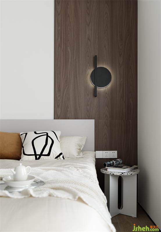 臥室床頭做了木飾面背景,與白色墻壁結(jié)合在一起,更顯簡(jiǎn)潔溫馨。床頭位置有限,放一張小邊幾代替床頭柜的功能,更加節(jié)省空間。