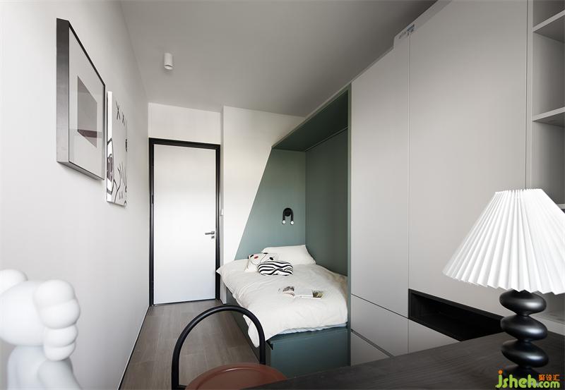 兒童房布局上選擇了榻榻米床+衣柜+書桌的組合設(shè)計(jì),空間利用到了最大化。房間以白色為主色調(diào),榻榻米床與背景墻局部涂刷綠色漆,將睡眠區(qū)與其他區(qū)域分隔開來(lái)。