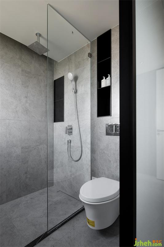 衛(wèi)生間濕區(qū)通過(guò)玻璃隔斷+擋水條將淋浴房與馬桶區(qū)域分割開來(lái),保持淋浴區(qū)外日?;顒?dòng)區(qū)域的干爽。兩個(gè)區(qū)域利用墻體做壁龕收納,節(jié)省空間的同時(shí)又能起到裝飾作用。
