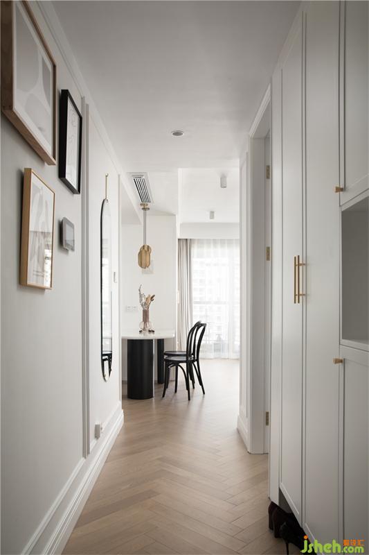 入戶左邊墻面PU線條框內(nèi),采用了一組藝術(shù)掛畫用來(lái)和對(duì)講機(jī)組合,法式裝修設(shè)計(jì)讓對(duì)講機(jī)隱藏與其中,配上一個(gè)橢圓的穿衣鏡,出門的時(shí)候整理著裝就變得方便很多,右邊是鞋柜和老人房的入戶暗門,每天進(jìn)出都將經(jīng)過(guò)如此藝術(shù)的場(chǎng)景,也是一件很美好的事情。