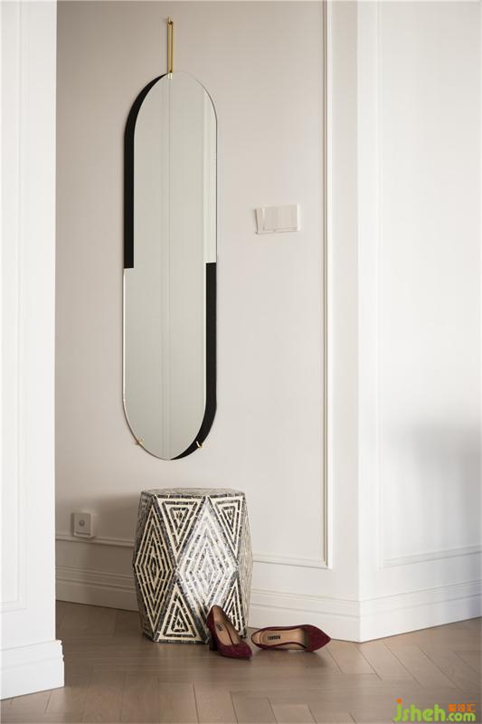 橢圓形的鏡子很好的綜合的墻面線條的韌性 ,柔化了視覺(jué)效果,配上一個(gè)充滿異域風(fēng)情的凳子,既可以裝飾用也可以作為換鞋凳,一面鏡子,看到的是自己也是人生。