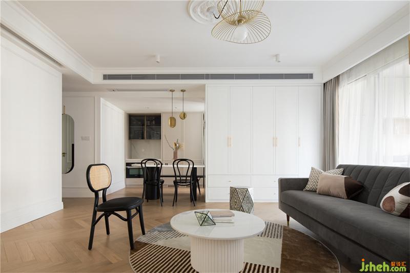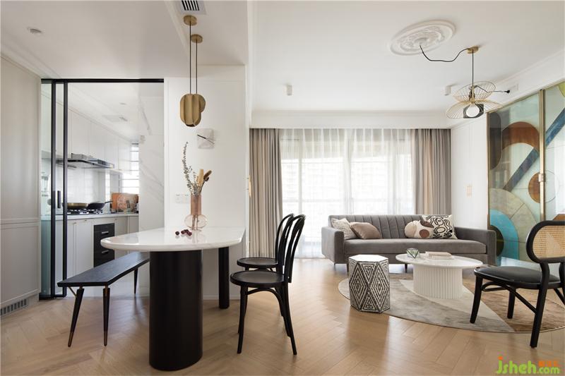 中廚和西廚之間通過(guò)兩扇玻璃聯(lián)動(dòng)門隔開(kāi),平時(shí)不炒菜的時(shí)候可以打開(kāi),法式裝修設(shè)計(jì)空間視覺(jué)流線更順暢,考慮到西廚和餐廳之間的尺度不是很大,因此設(shè)計(jì)了的餐桌是長(zhǎng)凳和有椅背的餐椅以及半圓形餐桌組合,側(cè)墻整面的收納柜,也解決了客廳所有的雜物收納。日常使用便利的同時(shí)也讓空間更加的開(kāi)闊。