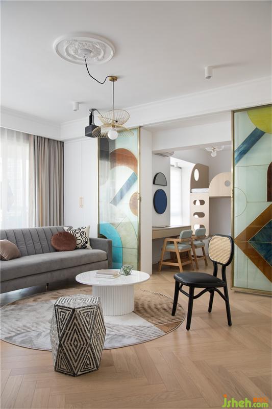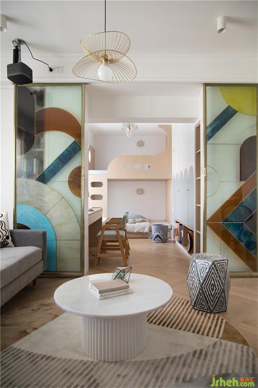 當(dāng)彩色玻璃屏風(fēng)門推開(kāi)的時(shí)候,雙層結(jié)構(gòu)的小孩房便和客廳融為一體形成了最獨(dú)特的風(fēng)景,而小朋友的活動(dòng)范圍也更加寬敞,與大人也多了更多的互動(dòng)。