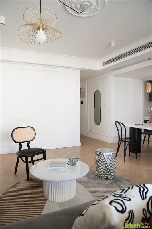 因?yàn)榭蛷d的中心和沙發(fā)的中心并不居中,所以特意將燈盤的位置居中設(shè)計(jì),通過(guò)一條吊線再次懸掛到沙發(fā)的頂部,這個(gè)有意思的設(shè)計(jì)就剛好解決了這些問(wèn)題。
