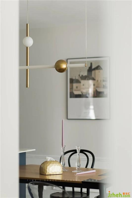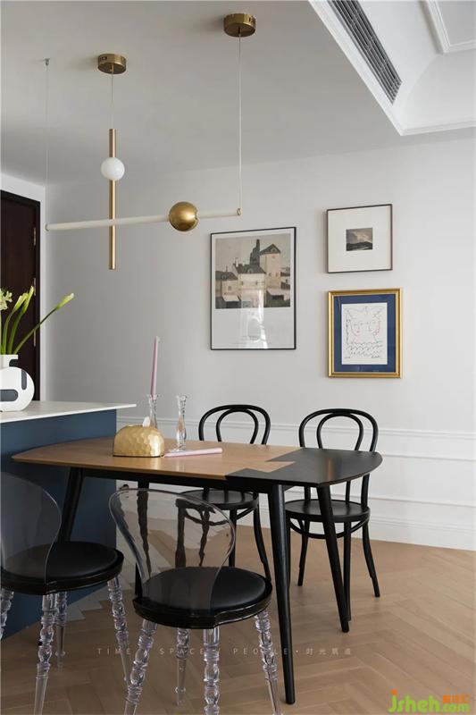 燕尾式拼接的餐桌和黑色的14號椅特別搭配,我們特意配了一張透明亞克力椅背的餐椅,減少椅子的存在感,增加空間的尺度感。