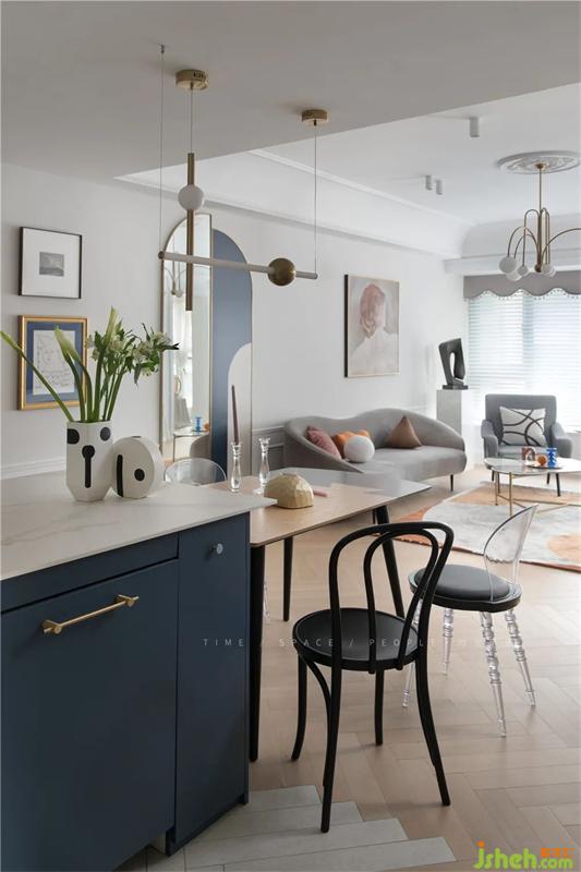 考慮到更好的打理,廚房和入戶都選用了瓷磚。法式家居設計通過瓷磚和人字地板的相互交錯,讓整個空間的過渡變得更自然。印象派的法式城堡和藍色邊框的畢加索的抽象畫和這藍色的島臺相得益彰。