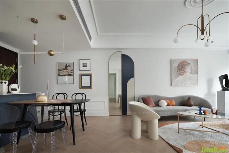 整面的沙發(fā)背景通過一個高低圓潤的原創(chuàng)屏風,法式家居設計將餐廳空間和客廳空間巧妙的區(qū)分開來,屏風的局部鏡面設計讓屏風顯得更加靈動,加強了走道空間的縱深感,當女主人從主臥一打開門,就像走T臺秀一樣,看見最閃亮的自己。