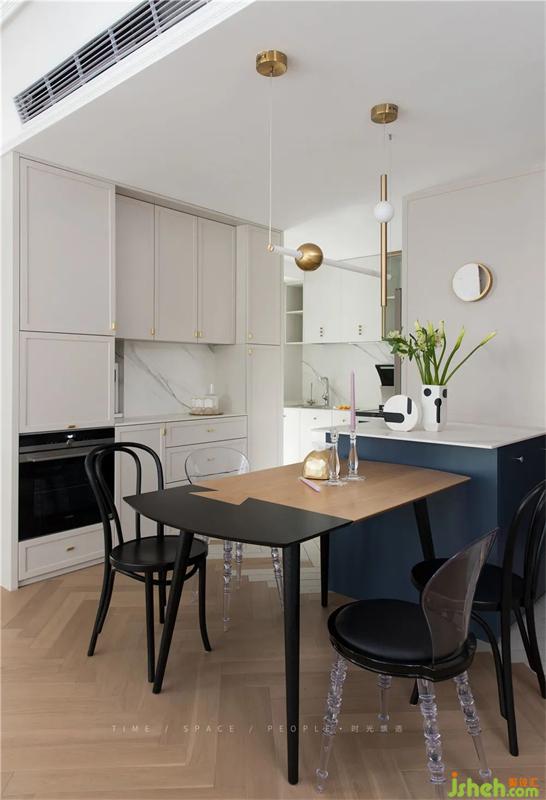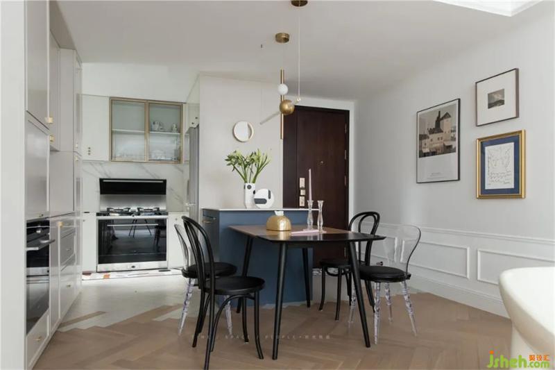 餐廳的全貌,可以看到地面的磚木交錯鋪貼讓餐廳和廚房空間相互區(qū)分又相互融合,居中式餐桌排布,法式家居設計讓空間流線達到最有效使用。唯一就是應該把入戶門顏色也協(xié)調(diào)下就更完美了。