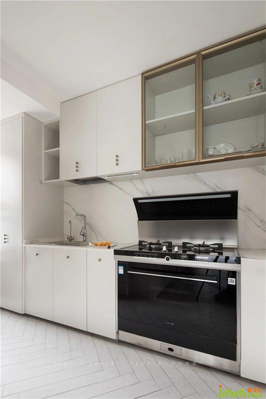 櫥柜拉手的陣列式排布,讓拉手也成為柜門的裝飾,隱藏式濾水籃的設計,讓功能兼顧美感。淺灰色水磨石的人字鋪搭配白色大花紋巖板,讓廚房大氣又充滿細節(jié)。