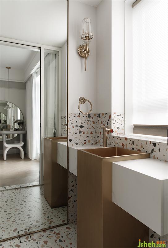 主衛(wèi)的設(shè)計(jì)在客廳的材質(zhì)選擇上進(jìn)行了延用,法式藝術(shù)設(shè)計(jì)不銹鋼洗手盆與法式的水晶壁燈一同呼應(yīng),彩色的水磨石瓷磚將空間變得生動(dòng)了起來。
