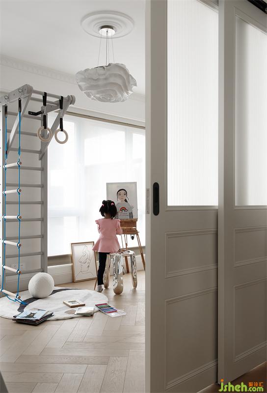 兒童房完美的隱藏在滑軌聯(lián)動(dòng)門的后面,國(guó)外原創(chuàng)冷門單品燈具,瞬間拉高了兒童空間的藝術(shù)調(diào)性。