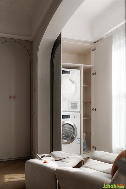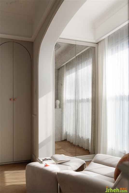 衣柜上的功能和入戶類似,特意安排在房門后面和床尾過道相對(duì),鏡子的大面積使用既能擴(kuò)展空間,又能有足夠的距離作為更衣鏡使用。
