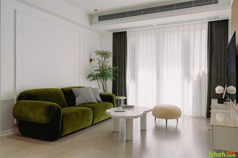客廳和陽臺(tái)用了一個(gè)玻璃門隔開,白色紗簾與墨綠色窗簾的組合,能夠在保證隱私的同時(shí)最大限度的引入自然采光。