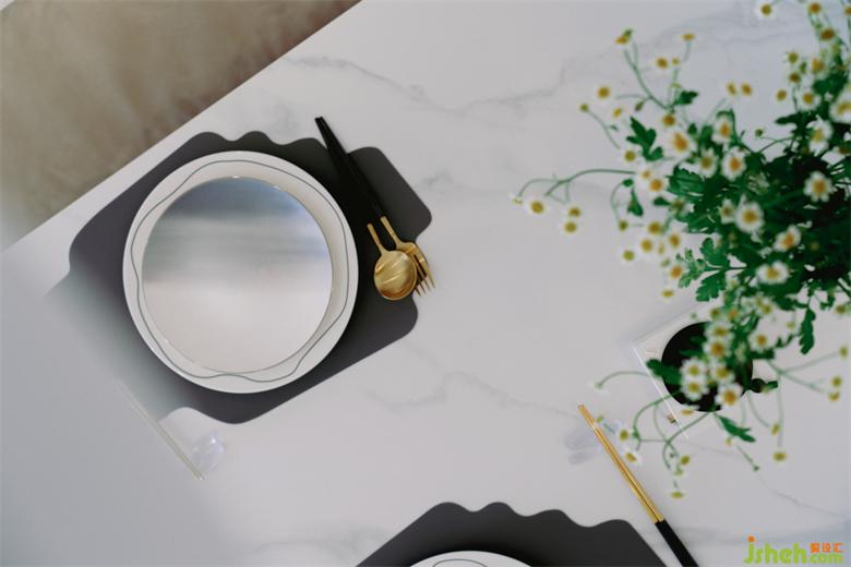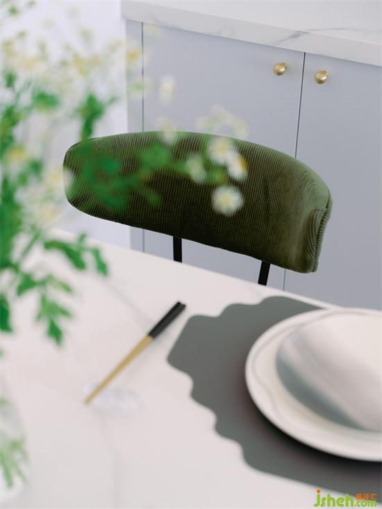 白色大理石紋的巖板餐桌,配上兩把墨綠色絲絨餐椅,再擺上精致的餐具和生機(jī)勃勃的花束的花束,大氣又不失活力。