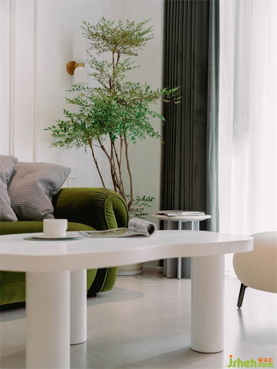 客廳以墨綠色絲絨沙發(fā)為主角,跳躍的綠色占據(jù)了客廳的視覺中心,家裝設(shè)計(jì)并與一側(cè)同色系的窗簾、落地綠植交相呼應(yīng),為空間營造出清新舒適的居家氛圍。
