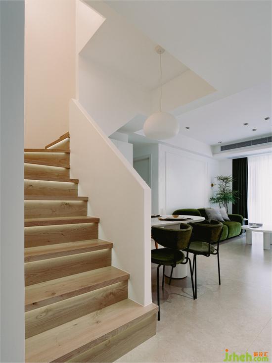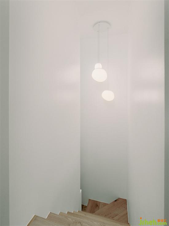 垂然而下的吊燈,搭配白色墻面與木質(zhì)臺(tái)階,讓狹窄的樓梯間更顯敞亮舒適。