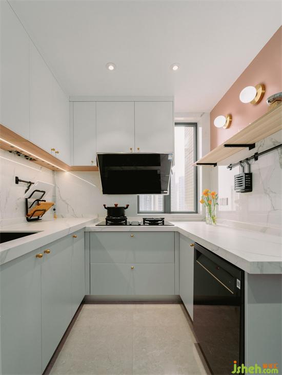 U型廚房布局,實(shí)現(xiàn)空間的最大化利用,白色吊柜+淺藍(lán)色的櫥柜組合,加上大理石紋臺(tái)面,與客廳沙發(fā)背景墻的配色保持一致,顯得精致又優(yōu)雅。