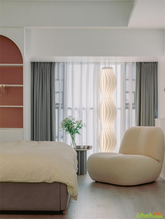 整面落地窗為臥室一角增添了休閑功能,柔軟的奶茶裸色懶人沙發(fā),將美感與舒適融于其中,散發(fā)出一種甜美復(fù)古的奶油感。家裝設(shè)計(jì)一旁的落地?zé)舭l(fā)出柔和舒適的光線,為空間更添一份溫馨。