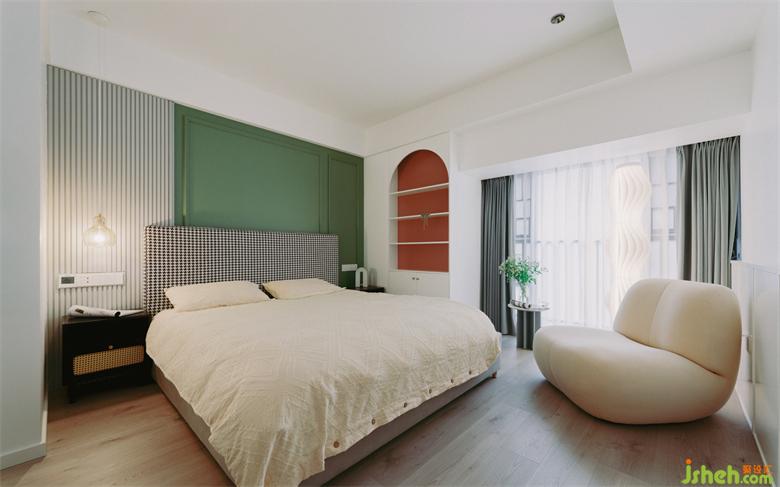 主臥以大面積的精致白色作為底色,加入復(fù)古綠與明亮的愛(ài)馬仕橙點(diǎn)綴,調(diào)和出靜謐又不失活力的空間氛圍。