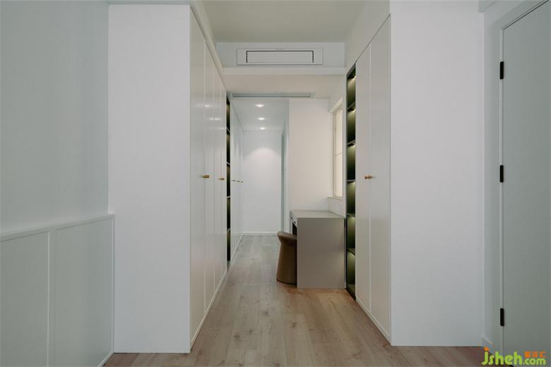 將主臥通往衛(wèi)生間的雞肋過(guò)道利用起來(lái),墻面隱藏兩排通天衣柜,打造步入式衣帽間。家裝設(shè)計(jì)衣柜局部設(shè)計(jì)成開(kāi)放格,可作展示也可作收納,實(shí)用性與顏值兩不誤。