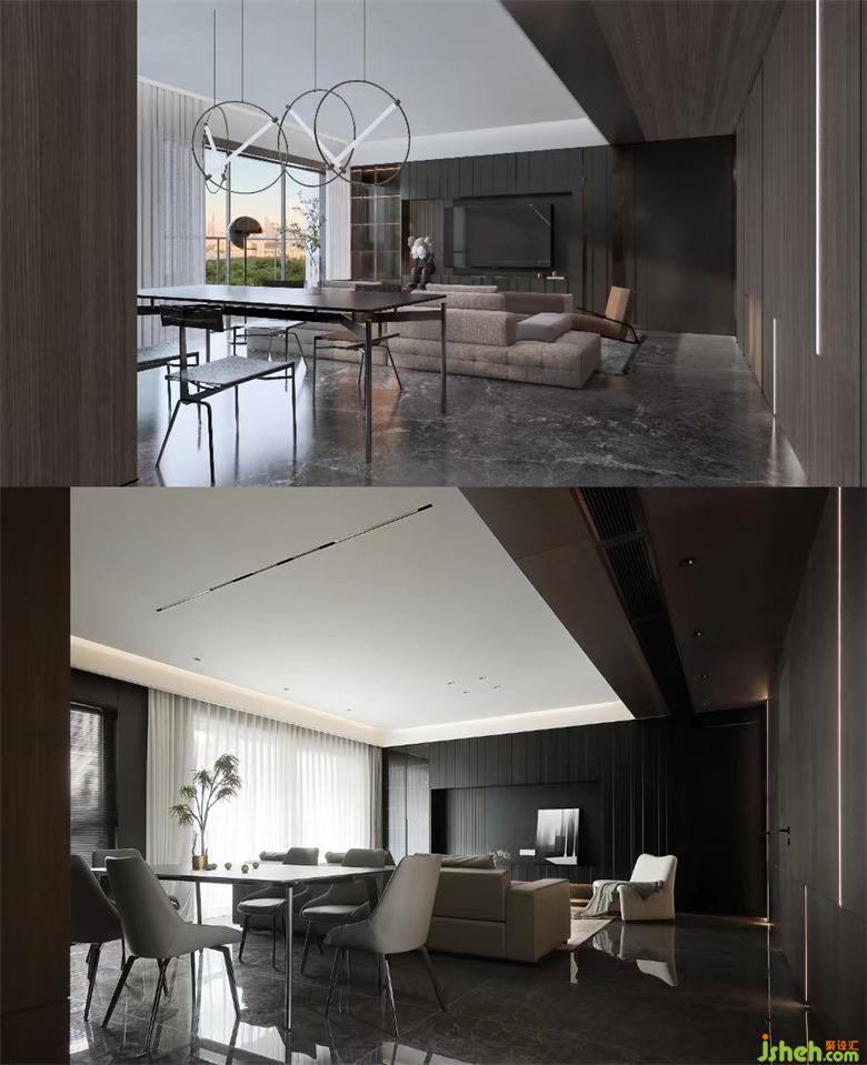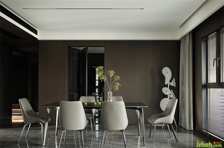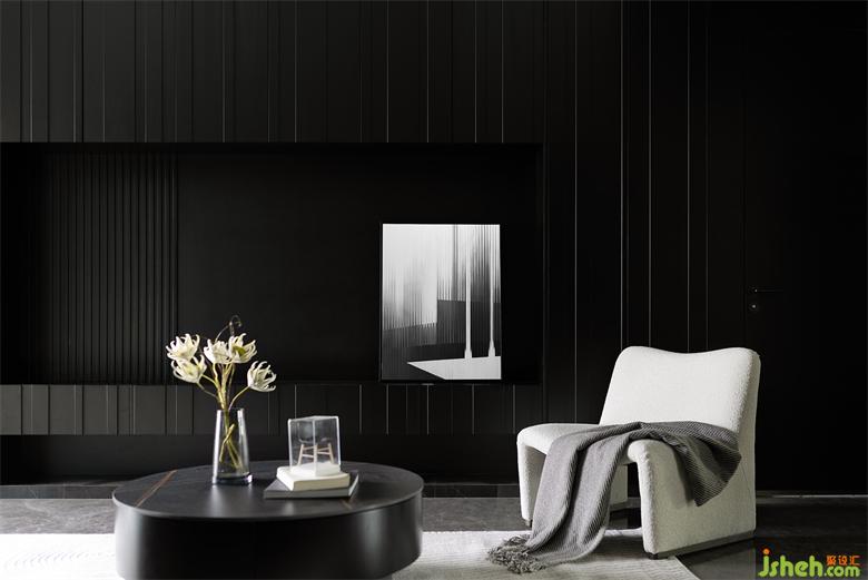 寬敞的公區(qū)一分為二,客餐廳融合且獨立,空間交流融洽又不顯雜亂。家裝設(shè)計毫無疑問的無主燈設(shè)計,主吊頂選擇留白處理,避免壓抑逼仄,其余墻面及頂部均以不同材質(zhì)飾面板覆蓋,將暗黑風(fēng)的質(zhì)感彰顯得淋漓盡致。