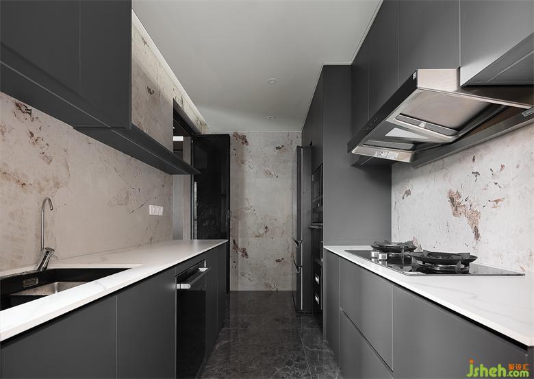 U型布局美觀實(shí)用,與公區(qū)保持一致,櫥柜選用灰黑色系,墻面鋪貼巖板,材質(zhì)自帶獨(dú)特紋理,家裝設(shè)計(jì)彰顯奢華高級(jí)質(zhì)感。