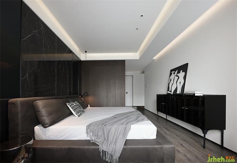 呼應(yīng)整體風格,地板也選用灰黑色,與木飾面保持統(tǒng)一。家裝設(shè)計床尾放置斗柜,柜門是黑色鏡面質(zhì)感,不同材質(zhì)豐富空間層次,黑白色調(diào)裝飾畫矗立在上,彰顯時尚氣息。