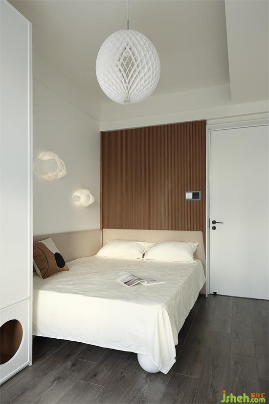 床頭背景墻選用木飾面與巖板組合裝飾,家裝設(shè)計層次與質(zhì)感都更加豐富,床頭燈的高度也是符合人體工學的設(shè)計,離地面90公分左右,躺在床上玩手機或是看書,不會晃到眼睛。