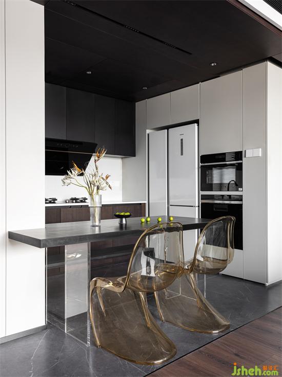 餐桌倚靠梁體,與廚房形成洄游動(dòng)線,使用過(guò)程更加便捷,櫥柜深淺不一,再次強(qiáng)調(diào)黑白灰的對(duì)比,與客廳形成呼應(yīng),自然且和諧。