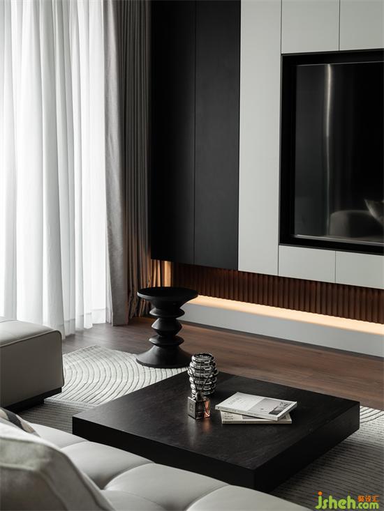 平衡的色調(diào)也是臺(tái)式風(fēng)格的一種表現(xiàn)手法,茶幾、邊幾和電視柜,同種啞光黑質(zhì)感,搭配灰色沙發(fā)和地毯,家裝設(shè)計(jì)黑白灰在空間中形成強(qiáng)烈對(duì)比,沒(méi)有濃烈的色彩,由此將高級(jí)感彰顯盡致。