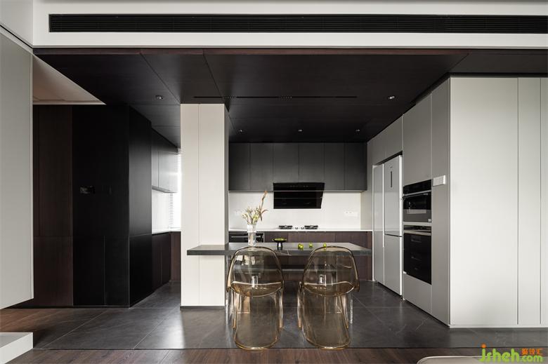 餐廚區(qū)域采用深色木材吊頂,與墻面質(zhì)感保持統(tǒng)一,家裝設(shè)計(jì)豐富空間層次,地面采用灰黑色瓷磚,與客廳地板自然分隔,極窄收口條自然過(guò)渡,簡(jiǎn)約大氣。