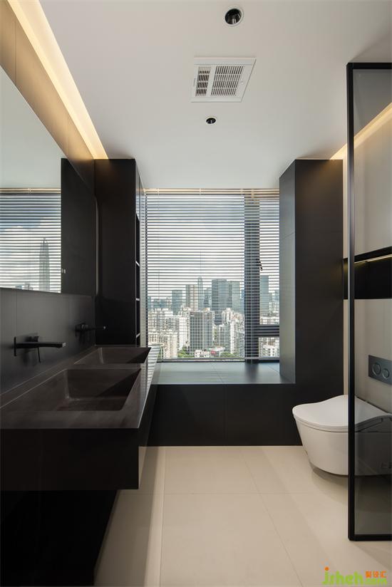 保留主衛(wèi)的飄窗部分,家裝設(shè)計采用防潮防水的飾面板包裹,呈現(xiàn)輕奢高級質(zhì)感。懸空雙臺盆搭配入墻水龍頭,盡展極簡美學(xué)。