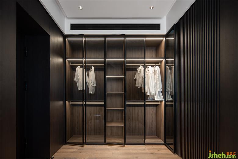 部分衣柜采用玻璃柜門,放置一些常穿衣物一目了然,內(nèi)嵌燈帶氛圍滿滿,作為展示區(qū)也是不錯的選擇,家裝設(shè)計增強(qiáng)衣帽間的功能性與靈動感。